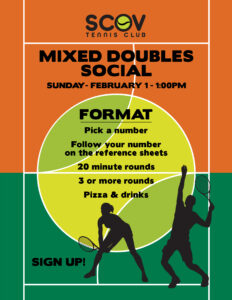 Mark your calendars for the Mixed Doubles Social Event, February 1, 2026 at 1:00 PM. Play some tennis and then enjoy pizza, beer and fun. Sign up at the Bulletin Board at the courts!